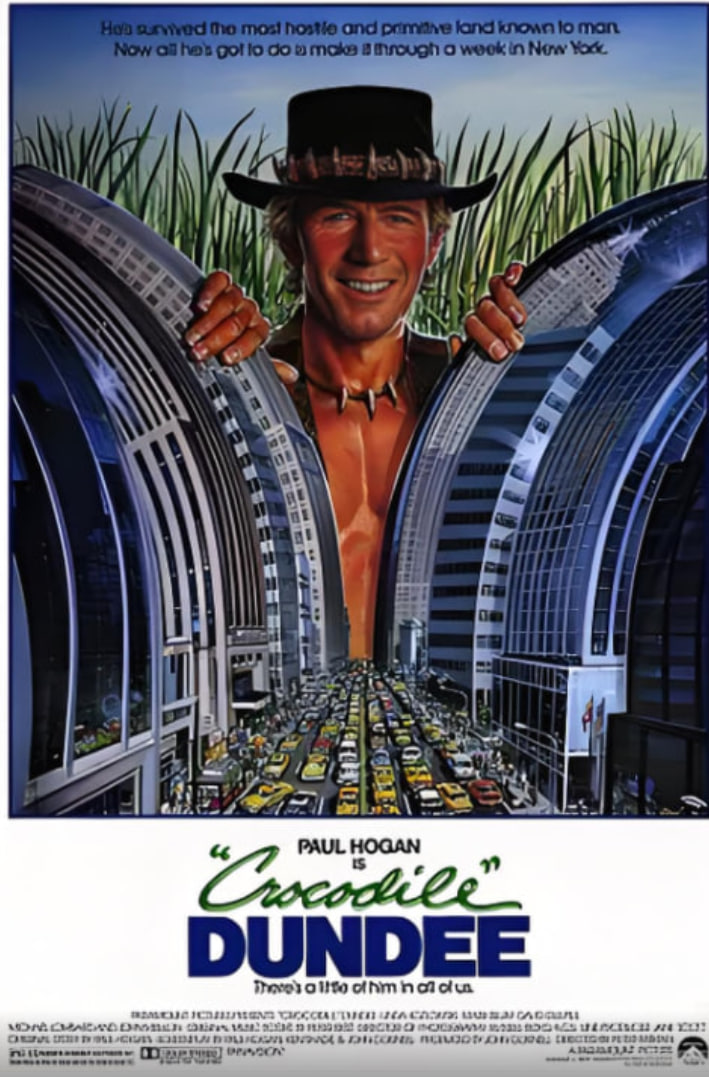 邓迪(保罗·霍根 饰)自小被非洲土著抚养长大,故对于传统的狩猎技能颇为精通。一次意外中,一条凶猛的鳄鱼攻击了邓迪,在腿部受伤的情况下,邓迪制服了鳄鱼,并靠其异常坚韧的意志力最终获